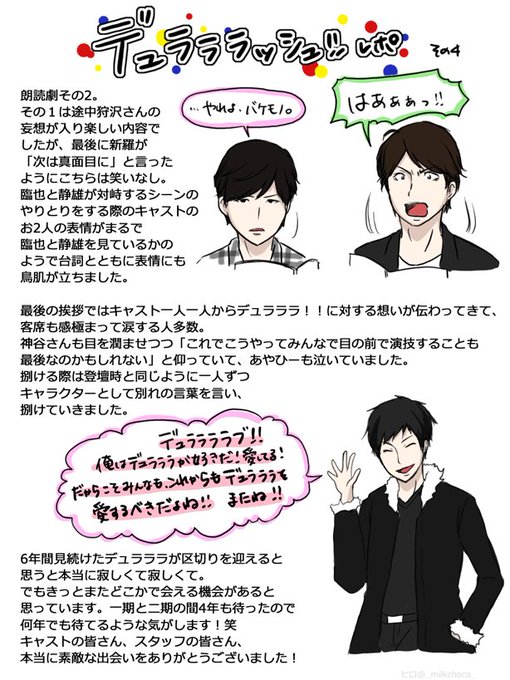 ヒロ در توییتر デュラララッシュ レポ いつもよりキャラ絵多いです そして来神組たちのボケが凄まじくて大喜利はほとんどレポできていません 笑 またいつか会える日まで妄想で耐えますよ ありがとう デュラララ